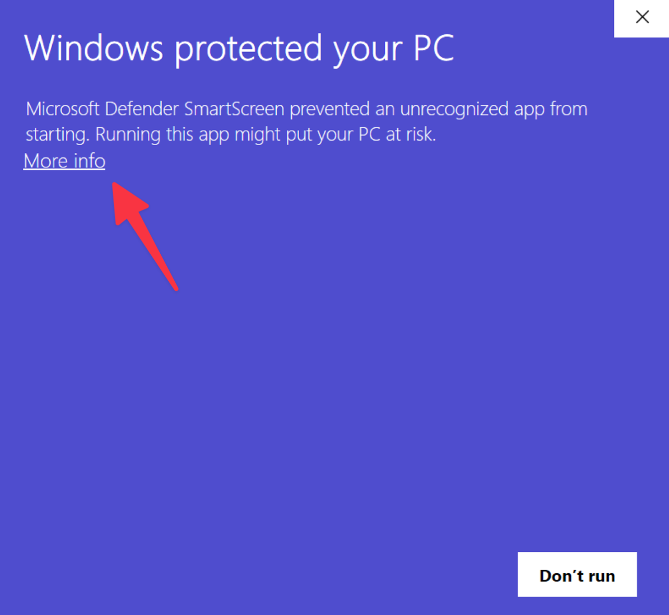 The user then has to click More Info and then Run Anyway to proceed. This can feel a bit scary for users.