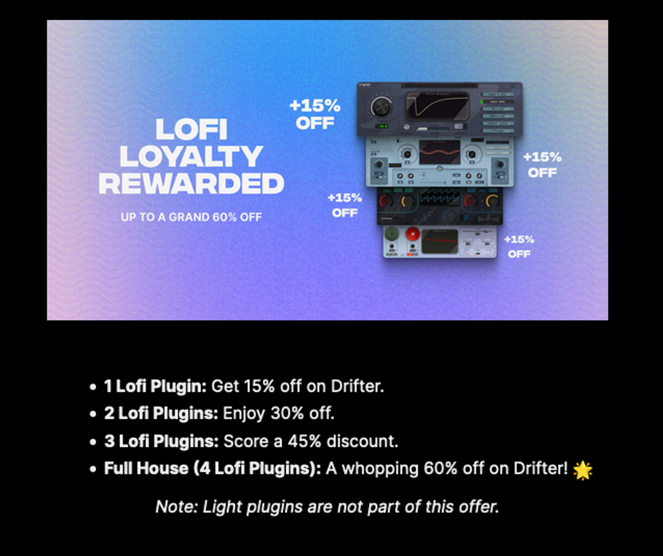 When Yum Audio launched their Lofi Drifter plugin, Moonbase made it possible for them to offer deeper discounts for owners of other plugins in their Lofi series.