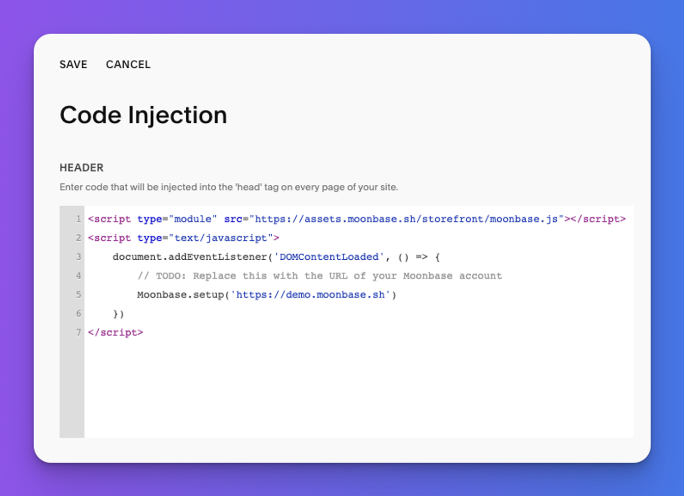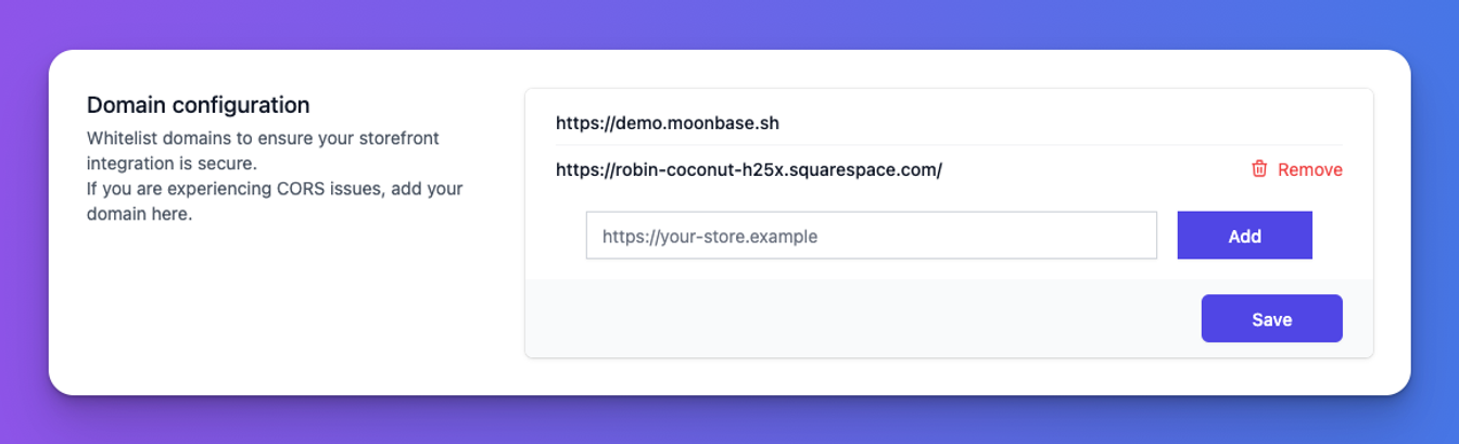 If your Squarespace website is on a domain that has not been registered on your Moonbase account before, make sure to whitelist it in your Moonbase account settings: