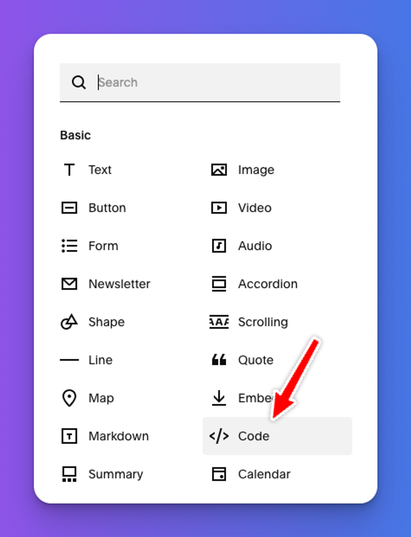 To use custom coded buttons, you can add code blocks with button markup that imitates the Squarespace buttons. To do that, add a Code block to your website:
