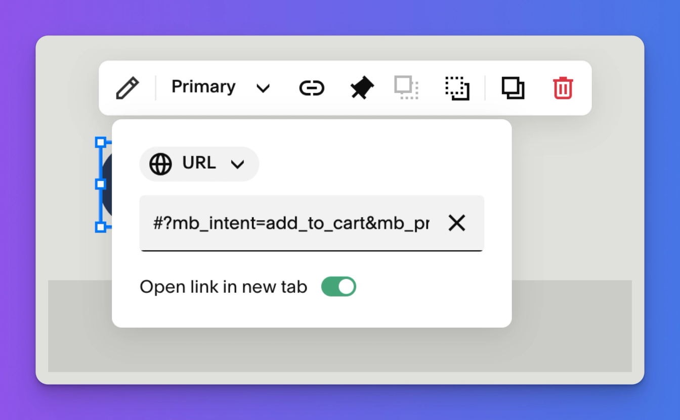To use the native buttons, simply add a button block to your site, and in the link use the link format of calling methods as described in the docs. For example, to add a product to cart, you can link to #?mb_intent=add_to_cart&mb_product_id=example-product: