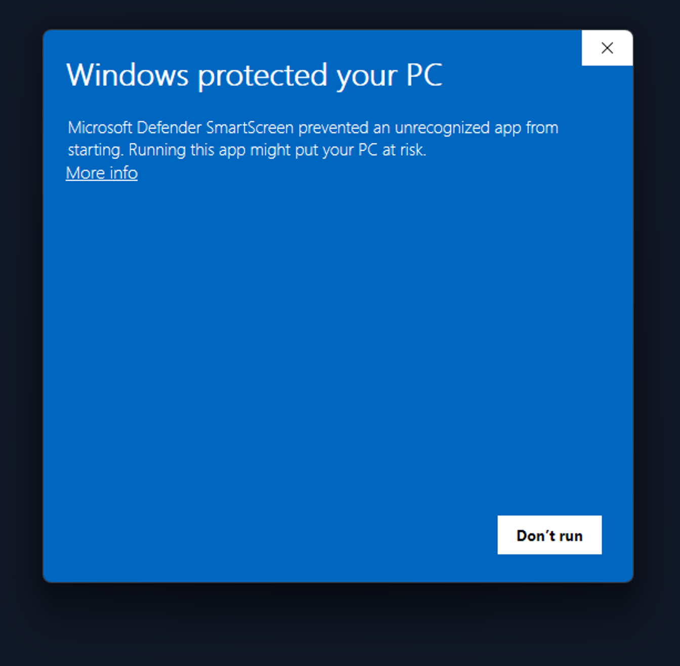 If you try running or installing unsigned binaries on Windows, you'll most likely be greeted by these warnings:
