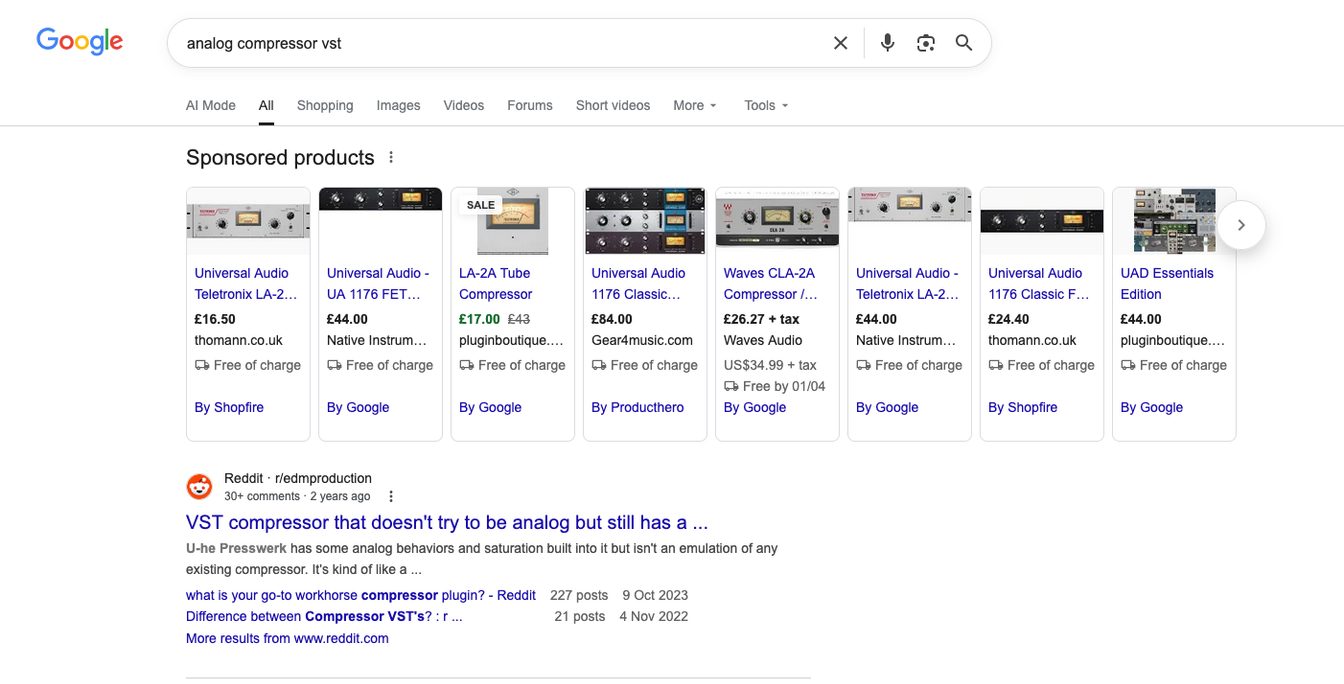 It’s not really built for plugins, and GMC will try to demand product SKU numbers and not understand that there’s no inherent shipping cost for a downloadable product… but it’s possible to put your plugins into it. I don’t think many really browse Google’s ‘Shopping’ tab for plugins, so the real advantage of GMC is for the Shopping Ads you get from time to time when you search for something like VST Compressor Plugin or Wurlitzer VST.