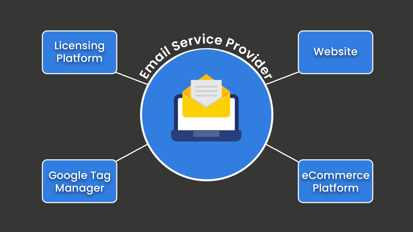 How to Connect your Email Service Provider: The obvious place is Your Website, where you should have sign-up forms on homepage and product pages. You should also pass across emails when people download a free trial or free piece of software. Data should be passed when any product is sold, so connect your ESP with your eCommerce Platform. And ideally, data should also be passed when someone activates a plugin or free trial, so you may need to connect your ESP with your Licensing Platform.