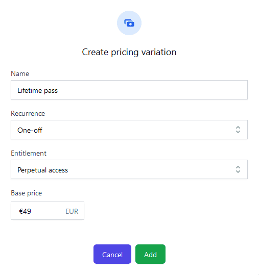 To be able to offer the same product at different rates or through different purchase models, Moonbase allows you to create pricing variations for all products. These variations will all be available through the Storefront APIs and SDKs, to enable you to fetch pricing and details of all options on demand. Variations contain configuration regarding recurrence (one-off purchase or a recurring subscription), entitlements (perpetual access or limited support updates) and pricing.