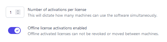 Through this configuration you can determine how many activations each license should allow simultaneously, as well as if offline activations should be allowed. While product activations using the online flow is always a floating activation, offline activations can never be moved to another device unless you as a merchant manually alter the activation.