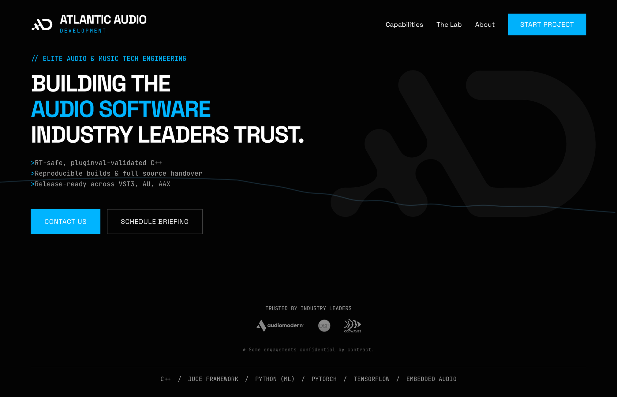 Atlantic Audio is a software engineering consultancy entirely focused on audio technology. The firm specializes in end-to-end development of professional audio applications, including JUCE-based plugins, C++ DSP algorithms, and increasingly machine learning systems for audio. Their client roster ranges from established audio software companies like Audiomodern and discoDSP to a growing number of individual musicians, producers, and YouTubers with product ideas but no infrastructure to bring them to market.